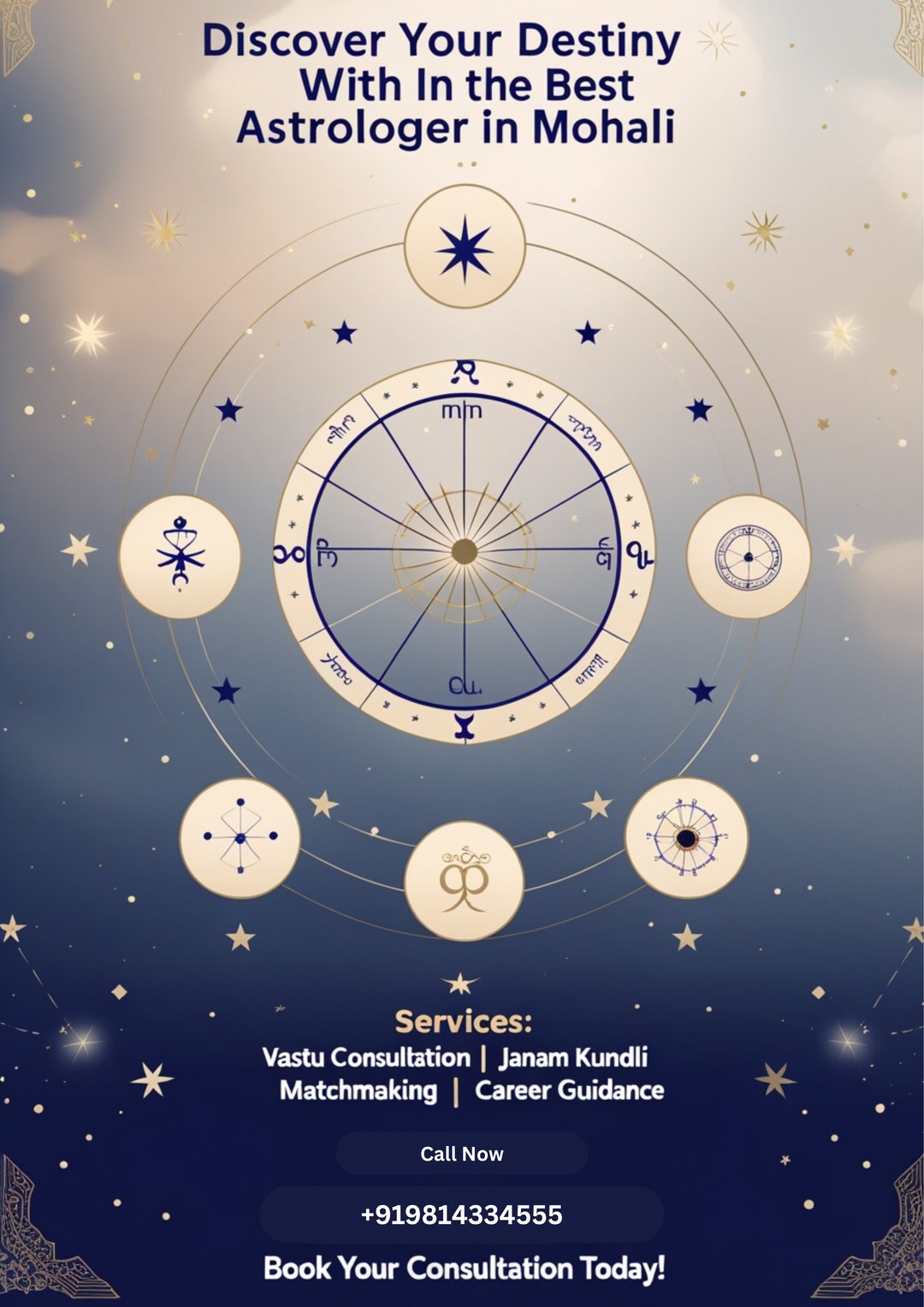 We offer personalized vastu consultation, kundli analysis, horoscope readings, matchmaking for marriage, and career astrology guidance based on your date and time of birth. Rooted in traditional Vedic astrology, we help clients gain clarity in relationships, career, health, and life decisions. Widely recognized as the best astrologer in Mohali, our expert provides accurate janam kundali and couple compatibility analysis. Trusted across Tricity—Mohali, Chandigarh, and Panchkula—for professional astrological services and reliable predictions. Book your consultation today and take the first step toward a better future.